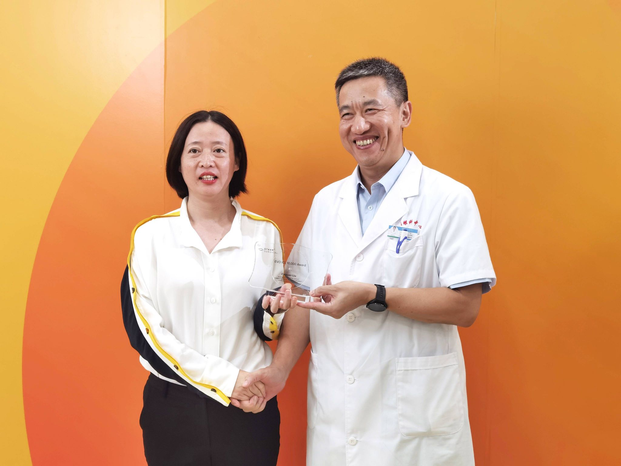 9月22日下午,EVO ICL官方研發(fā)機構(gòu)STAAR Surgical公司代表為廈門眼科中心業(yè)務(wù)副院長、ICL核心專家委員會首屆委員劉才遠教授頒發(fā)了『EVO ICL 10000 例』獎?wù)?,以表彰其ICL晶體植入量正式突破10000例。