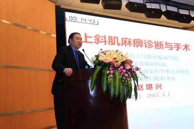 眼科醫(yī)院集團(tuán)專家委員會(huì)主席趙堪興教授帶來(lái)了題為《上斜肌麻痹診斷與手術(shù)》的主題演講。趙教授深入淺出的向大家介紹了SOP的7種臨床分型,并認(rèn)為在治療過(guò)程中需根據(jù)臨床發(fā)展階段、分型,選擇治療方式。趙教授表示垂直、旋轉(zhuǎn)肌肉手術(shù)的非共同性結(jié)果非常明顯,在實(shí)施手術(shù)肌肉的功能位上效果最大,其它注視位矯正效果遞減。
