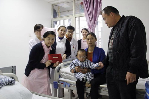 由于小燦寶家境不好,全家九口人,上面有年邁的爺爺奶奶,加上小燦寶兩兄弟,小燦寶媽媽要照顧兩個(gè)年幼的孩子無(wú)法工作,另外,小燦寶大伯幾年前去世,小燦寶大伯母離家未歸,大伯家的三個(gè)孩子也是小燦寶父母代為照顧,九口人只有小燦寶爸爸工作養(yǎng)家。護(hù)士梁嘉惠了解到情況后,與護(hù)士長(zhǎng)陳秋蓮商量在微信朋友圈發(fā)起愛心捐款。經(jīng)過(guò)三天募集,一共募集到9926元善款。