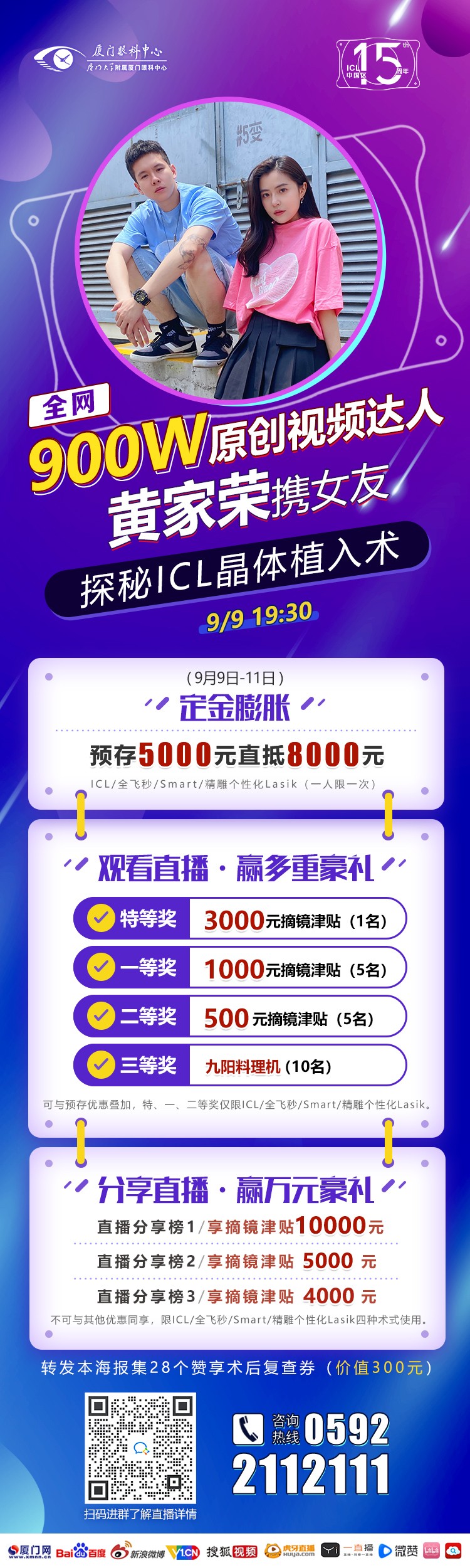 所以——摘鏡嗎?摘鏡!9月9日19:30,黃家榮將攜女友小山楂,和廈門眼科中心陳亮副主任一起為大家展示ICL手術(shù)全過程,直播期間,還會為大家?guī)矶喽嗟恼R福利哦