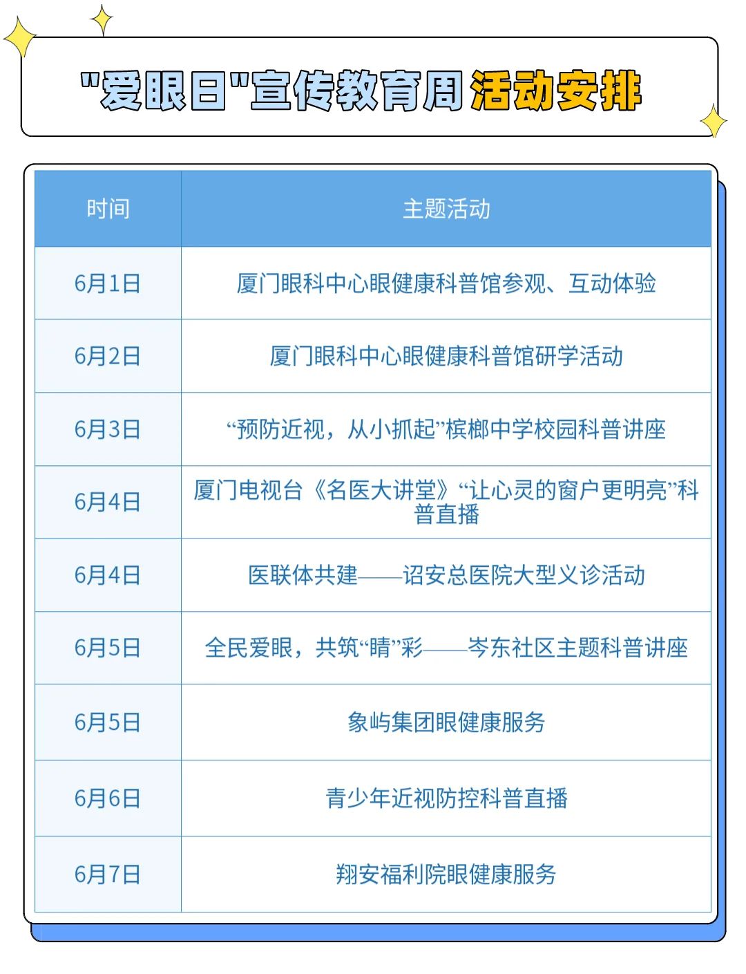 六月愛眼月期間,廈門眼科中心依托八大亞??频膶I(yè)實力,計劃將開展八大亞專科眼健康科普直播和百場公益診療活動,并將制作百期科普視頻,廣泛布局科普宣傳渠道,大力宣傳全年齡段全生命周期眼健康的重要意義。期望通過系列活動助力加強眼病早期篩查、推行眼健康科普宣傳,提升人民群眾的疾病認知水平,推動眼病預(yù)防關(guān)口前移。
