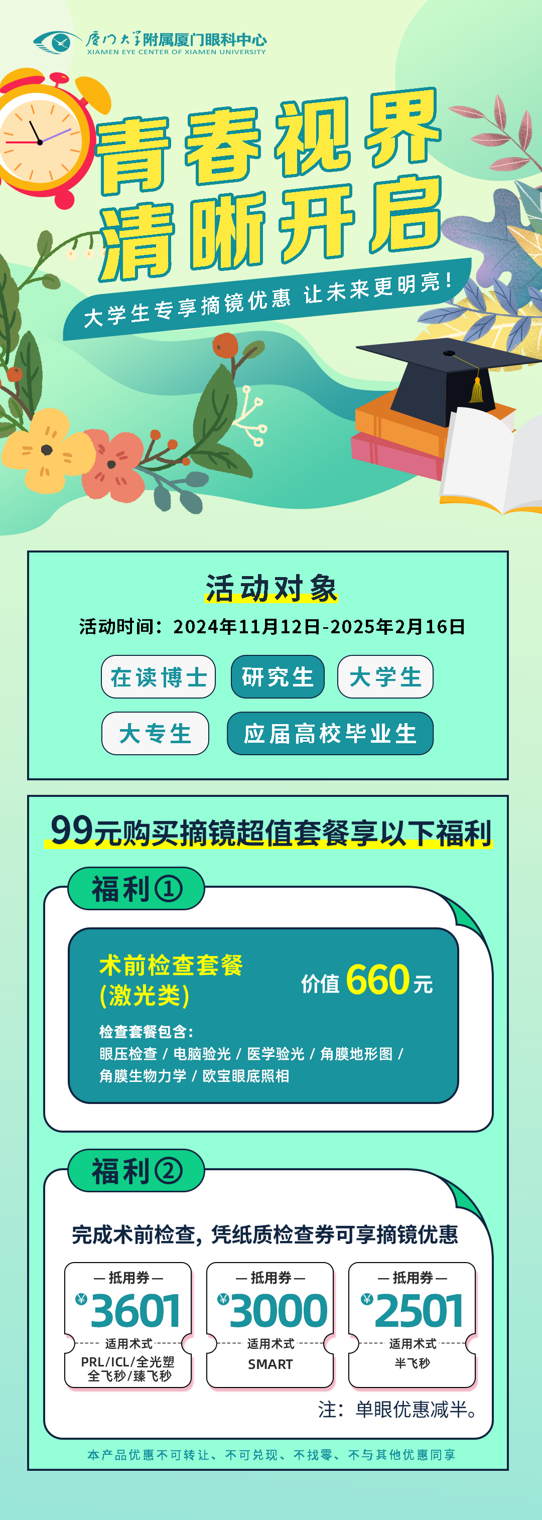 近幾年,大學生做近視手術已屢見不鮮,在走進大學校園時或剛剛畢業(yè)準備就業(yè)時選擇做近視手術仿佛已經(jīng)成為一種“風尚”。那么身為“大學生”群體中的一員,做近視手術會不會有優(yōu)惠呢?近期不少福建大學生都在后臺留言。一起來看看吧!
