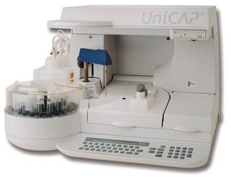 UniCAP是一先進的實驗室系統(tǒng),包括體外檢測試劑和高度自動化的儀器。所有的操作步驟:加樣、加試劑及ImmunoCAP、孵育、清洗和計算,全部自動化。而且,嚴格控制測試條件,包括內部儲存的標準曲線,確保實驗結果的真實可靠。從一簡單的血樣,UniCAP可快速而準確地得到檢測結果。