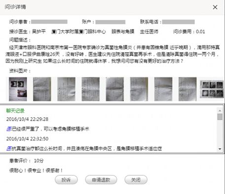 眼科醫(yī)院和南京第一醫(yī)院專家確診為真菌性角膜炎,并患有圓錐角膜近乎晚期,使用相關(guān)藥物沒有好轉(zhuǎn),江西當?shù)氐尼t(yī)生建議其先住院清除真菌再手術(shù)。因為清除真菌得住院一兩個月,剛上研究生的他如果長時間住院就得休學,實在進退兩難的他,通過眼科通APP接通了廈門眼科中心眼表與角膜專科的學科帶頭人吳護平主任的問診服務(wù),盡管已經(jīng)22:30,吳護平主任還是耐心解答了他的疑問,并且給出了盡快做角膜移植手術(shù)的建議。因為廈門眼科中心有與華廈眼科醫(yī)院集團下各地的眼庫聯(lián)動,所以患者很快就有角膜材料。吳護平30分鐘內(nèi)的4個答復就大大緩解了小雷的焦慮,避免了休學危機,他連連道謝并打算盡快接受手術(shù)。