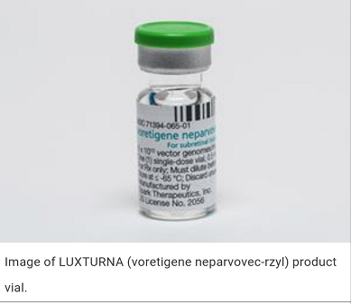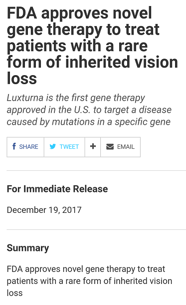 圣誕前夕,從美國(guó)傳來(lái)了重磅消息:“針對(duì)由RPE65基因突變導(dǎo)致的雷柏氏先天性黑朦2型(RPE65基因突變引起)的基因替代療法藥物L(fēng)uxturna(voretigene neparvovec-rzyl)獲FDA批準(zhǔn)上市!失明患者重見(jiàn)光明為時(shí)不遠(yuǎn)!
