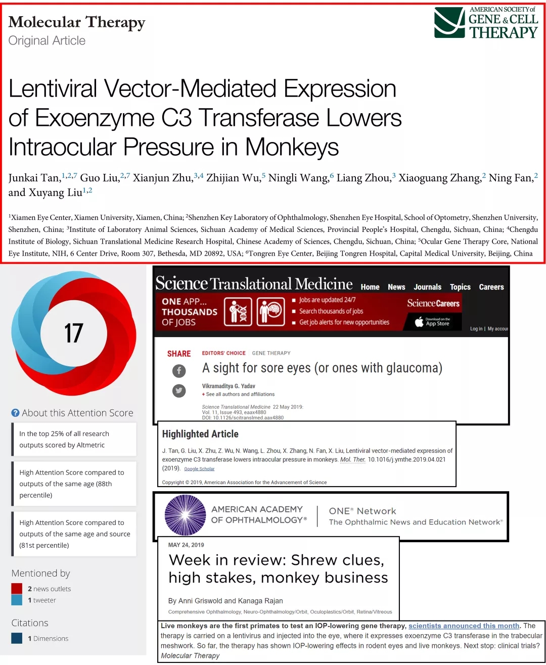 該項研究是以非人靈長類動物恒河猴為實驗對象,應(yīng)用失活病毒作為載體,將有利于房水排出的基因?qū)牒镅坌×?主要房水排出通道),能引起長達112天的眼壓下降,并且未見不良反應(yīng)。此前,成功地將功能基因?qū)牒镅坌×航M織并發(fā)揮降眼壓作用尚未見報道。隨即國際雜志《Science Translational Medicine》(影響因子18分)推薦了該篇研究論文,接著美國眼科學(xué)會(AAO)官方網(wǎng)站對其進行了報道,兩者均認(rèn)為此項研究有較好的學(xué)術(shù)價值和臨床應(yīng)用前景。目前該篇文章的Altmetric評分(社會化影響力)為17。這是繼近年來年劉旭陽教授團隊在發(fā)表多篇系列研究論文(如去年的美國IOVS雜志)后的又一成果展示,標(biāo)志著該團隊在青光眼基因治療方面的工作正在穩(wěn)步發(fā)展。目前該團隊的相關(guān)工作仍在繼續(xù),比如用改進的基因治療方法已經(jīng)降低猴眼壓達10個月以上,新的文章已經(jīng)投稿,并有望于今年發(fā)表。