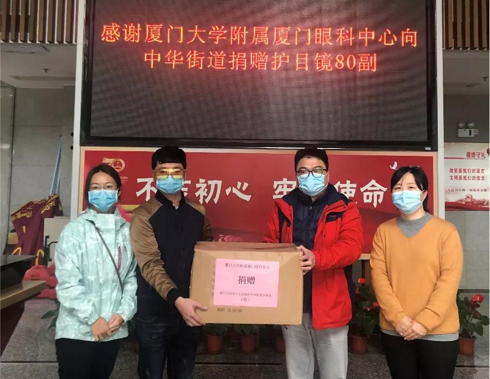 “主任您好,你們辛苦了。這是我們廈門大學(xué)附屬廈門眼科中心捐贈的護(hù)目鏡,請您代表貴街道接收。相信我們會戰(zhàn)勝疫情,迎來美好的春天!”