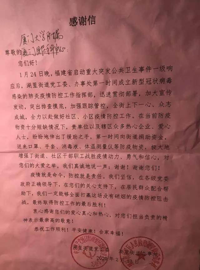 在中華街道辦,街道在LED大屏上打上了“感謝廈門大學(xué)附屬廈門眼科中心向中華街道捐贈護(hù)目鏡”;廈港街道辦為醫(yī)院頒發(fā)了榮譽(yù)證書;還有湖里街道辦、金山街道辦等街道也寫了一封封誠摯的感謝信。