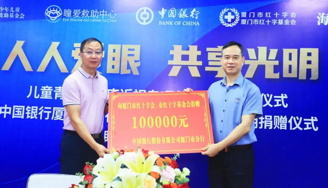 活動當(dāng)天,還舉辦了中國銀行股份有限公司廈門市分行、廈門市紅十字會光明捐贈儀式。中國銀行廈門分行積極擔(dān)當(dāng)社會責(zé)任、履行社會義務(wù),在愛眼日來臨之際,向廈門市紅十字基金會捐贈10萬元,用于困難眼疾患者的救助。