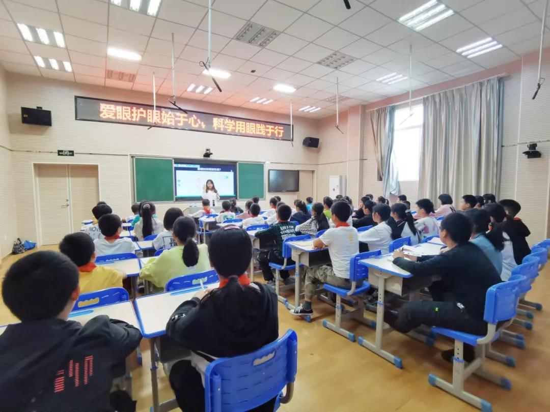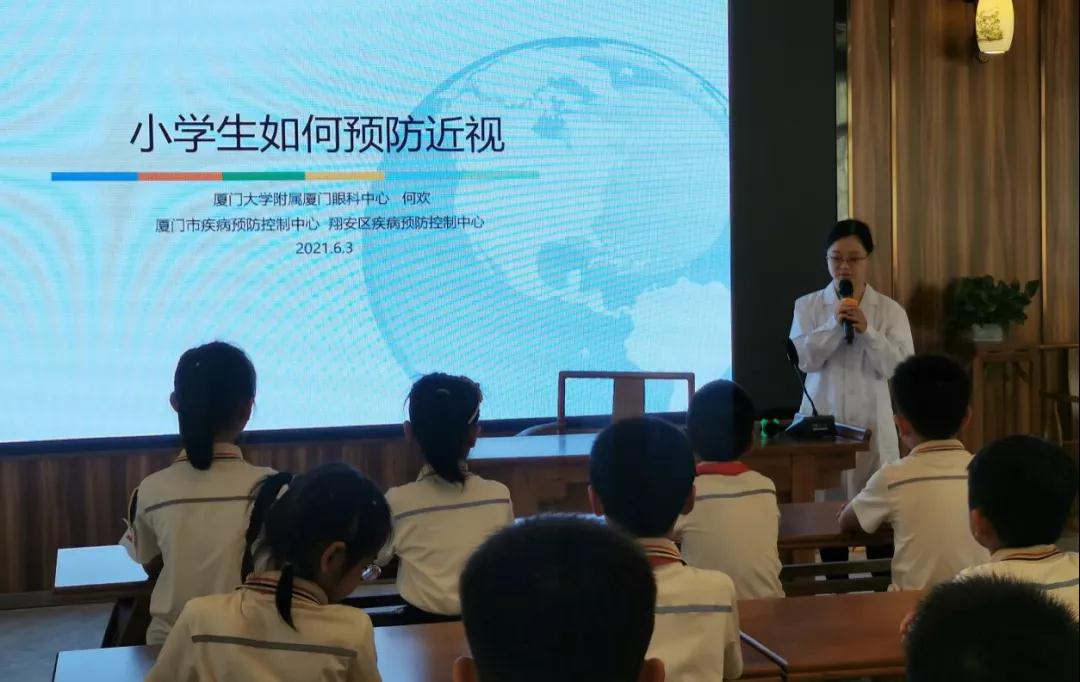 ▲廈門眼科中心斜視與小兒眼科副主任醫(yī)師何歡為小學(xué)生進行近視防控科普