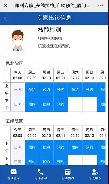 預(yù)約步驟:預(yù)約到診-核酸檢測(cè)預(yù)約-醫(yī)療機(jī)構(gòu)(廈門大學(xué)附屬?gòu)B門眼科中心)-選擇思北/五緣院區(qū)-選擇時(shí)間預(yù)約