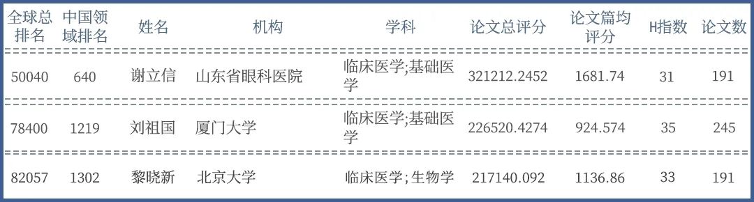 近日,全球?qū)W者庫(kù)網(wǎng)站公布了2022年“全球頂 尖前10萬(wàn)科學(xué)家”榜單,27位中國(guó)眼科界專(zhuān)家學(xué)者進(jìn)入該榜單,在中國(guó)醫(yī)學(xué)界1799名入選者中占1.5%。其中,廈門(mén)眼科中心共有多位專(zhuān)家上榜,分別是廈門(mén)眼科中心總院長(zhǎng)黎曉新教授、院長(zhǎng)劉祖國(guó)教授,以及廈門(mén)眼科中心院士工作站謝立信院士。