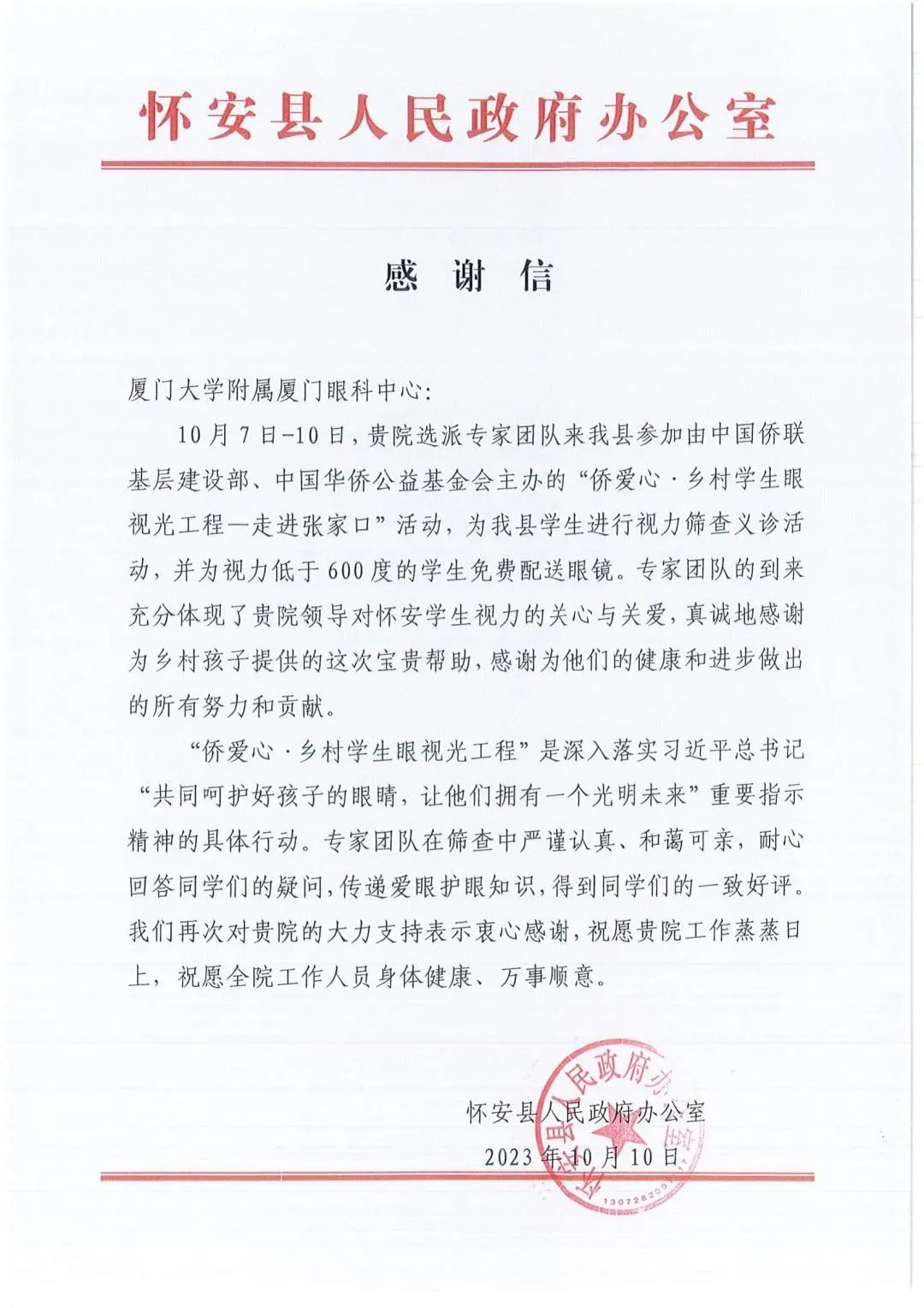 近日,廈門眼科中心接連收到來自中國僑聯(lián)基層建設(shè)部、懷安縣和張北縣人民政府辦公室的三封感謝信,信中對廈門眼科中心在“僑愛心·鄉(xiāng)村學(xué)生眼視光工程-走進(jìn)河北張家口”公益活動中的無私付出及對鄉(xiāng)村孩子的寶貴的幫助給予充分認(rèn)可與真摯感謝。