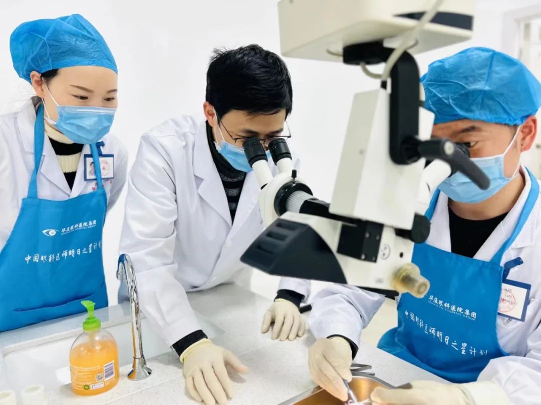 ▲修陽暉(中)帶教中國眼科明日之星學員進行動物眼顯微手術操作
