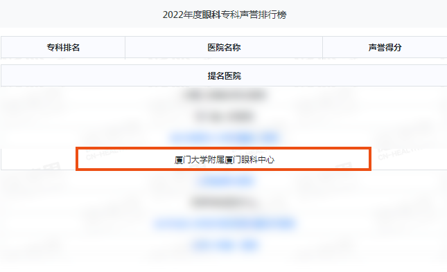11月25日,由國內(nèi)著名同行專家擔(dān)任評(píng)審的復(fù)旦版《2022年度中國醫(yī)院綜合排行榜》和復(fù)旦版《2022年度中國醫(yī)院??坡曌u(yù)排行榜》在上海市發(fā)布。廈門眼科中心榮獲2022年度眼科??坡曌u(yù)排行榜提名,是全福建省唯一上榜的??漆t(yī)院,且已經(jīng)是廈門眼科中心連續(xù)第五年上榜!