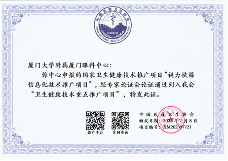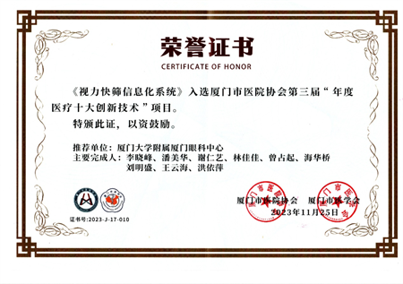 11月25日,在廈門市醫(yī)院協(xié)會(huì)第三屆年會(huì)暨“學(xué)科引領(lǐng)高質(zhì)量發(fā)展”學(xué)術(shù)會(huì)議上,廈門大學(xué)附屬廈門眼科中心“視力快篩信息化系統(tǒng)”榮獲廈門市醫(yī)院協(xié)會(huì)第三屆“年度醫(yī)療十大創(chuàng)新技術(shù)”項(xiàng)目,同時(shí)“視力快篩信息化技術(shù)推廣項(xiàng)目”經(jīng)國家衛(wèi)生健康技術(shù)應(yīng)用推廣項(xiàng)目專家論證會(huì)論證,成功入選中國民族衛(wèi)生協(xié)會(huì)2023年度“衛(wèi)生健康技術(shù)重點(diǎn)推廣項(xiàng)目”。
