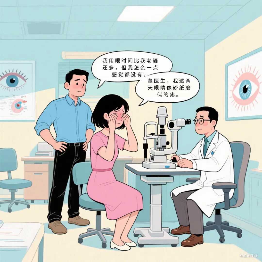 剛結(jié)束加班的設(shè)計(jì)師麗麗不停揉著發(fā)紅的眼睛:"董醫(yī)生,我這兩天眼睛像砂紙磨似的疼。"而陪她來的程序員丈夫阿強(qiáng)插話:"我用眼時(shí)間比我老婆還多,但我怎么一點(diǎn)感覺都沒有。"