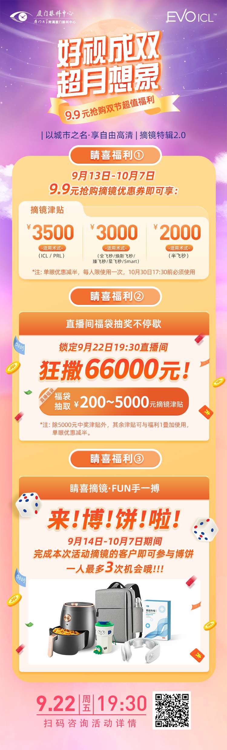 即日起至10月7日,廈門(mén)眼科中心9.9元購(gòu)至高3500元摘鏡津貼,9月22日19:30狂撒66000元福利,更有機(jī)會(huì)抽取錦鯉獎(jiǎng)5000元津貼,活動(dòng)期間完成手術(shù)還能博餅哦~