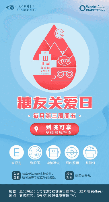 廈門眼科中心設(shè)立糖友關(guān)愛日,以倡導(dǎo)早檢查、早發(fā)現(xiàn)、早治療、長期隨診為核心,為糖尿病患者及其家屬建立眼健康檔案,并提供控糖指導(dǎo)、眼健康篩查、慢病跟蹤管理等專業(yè)診療服務(wù),從而保障糖尿病患者的視覺質(zhì)量,從根本上降低糖尿病的致盲率。