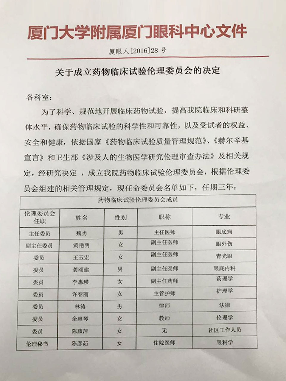 關(guān)于成立藥物臨床試驗倫理委員會的決定